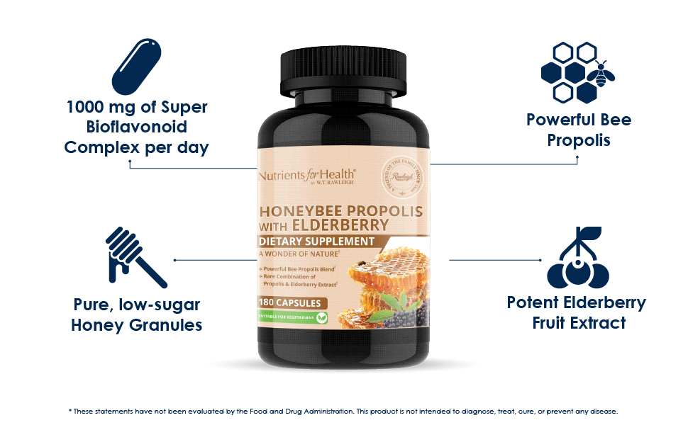 Nutrition from the beehive - nature's pharmacy | Daily dose provides 1000mg pure, powerful, natural, proprietary blend of Propolis, Elderberry fruit extract, and Honey | Super bioflavonoid complex | Suitable for Vegetarians | Immunity & allergy support | 2 easy to swallow capsules per day - 3 month's supply | Made in USA | Best quality - manufactured in certified GMP facility.*