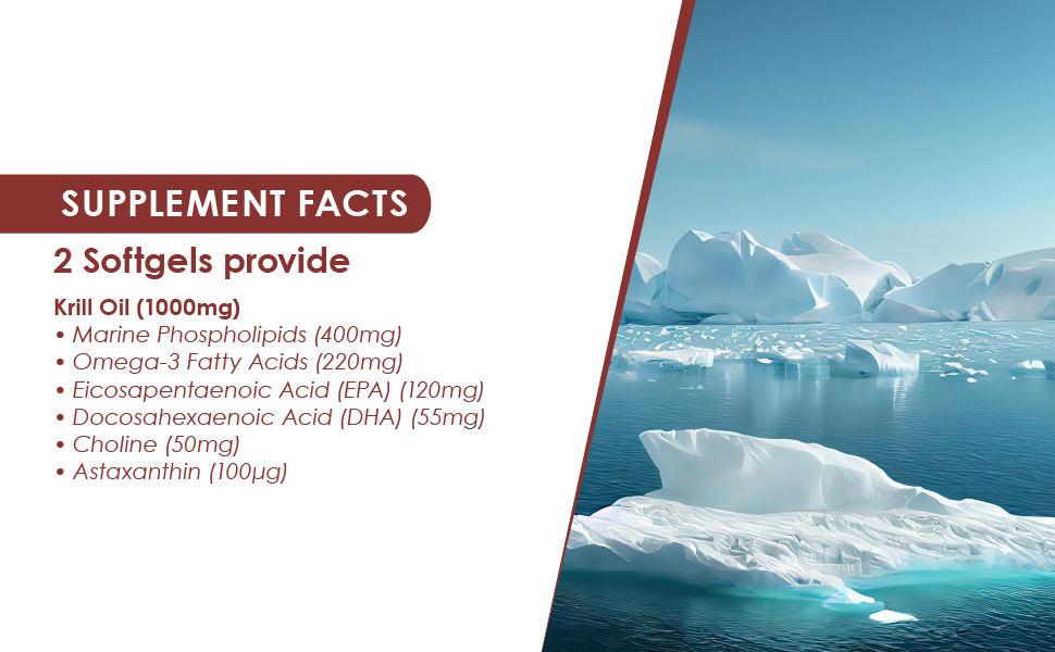 Antarctic Krill Oil, Softgel capsule (bovine gelatin, glycerol, sorbitol, water and ethyl vanillin).